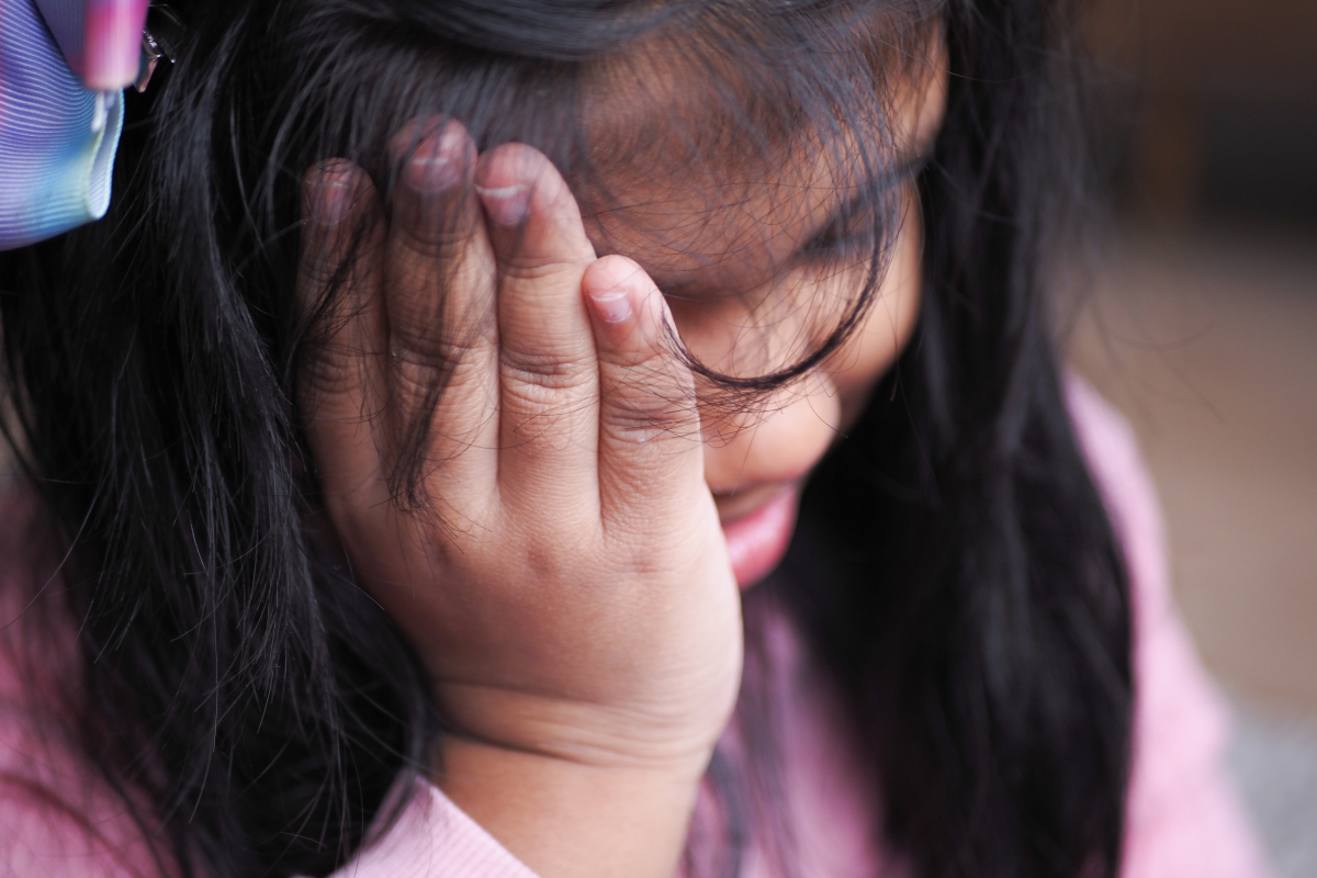 女人心情低落心情不好的女孩,她把他的头小孩哭着把手拉在一个浅色的